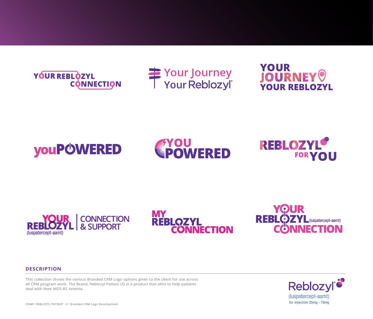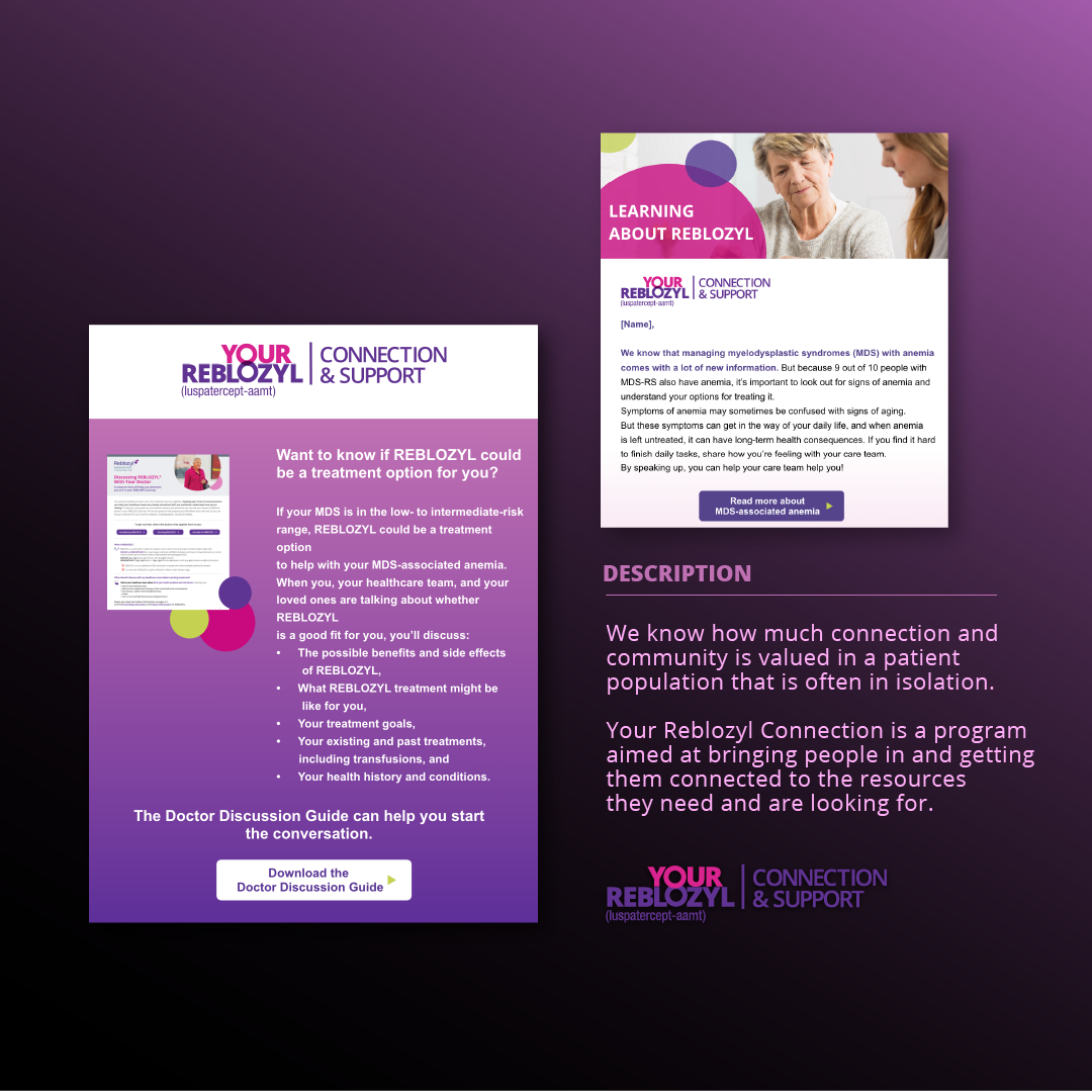 Array of Reblozyl Patient US work including logo creation for CRM program, social media, and email template